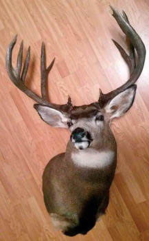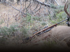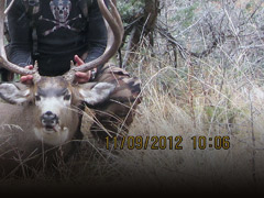 Next thing you know I hear thump, thump, thump! I looked down the hill through the trees and saw a doe standing there. I watched her for a second and I could hear another deer. The doe started to walk across the hill and up a little. The wind was good so I figured I'd try to cut her off to see if I could get a look at the other deer. I got about 60 yards down the hill when, to my right, I saw a deer’s face through some sticks and junipers. I used my breath to check the wind and it was coming right into my face. I brought my binos up on the deer. Antlers came out to its ears and turned up. I was positive it was a four-point but couldn't quite tell. Then the deer laid down. His head was sideway, so I started counting points on his antlers. I quickly counted, "One, two, three, four, five, six, seven!” He had to be at least four on one side.