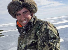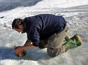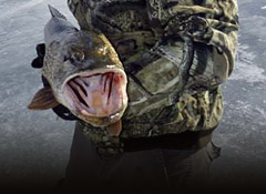 On day one, we lost nine leaders to mysterious creatures that bit them in half. It was exciting non-stop action, as flags seemed to go up every five minutes. Then “zing” my pole flag went up. My automatic fisherman rod flew into the air and we all went running. Whatever was on the end of the quick strike rig made the entire rod vanish into the hole with me almost with it. It now appeared the lines were wrapping around each other setting off another flag, which led to mass anarchy on the ice. Then, having endured enough, the fish took a powerful run and bent the rod to a ninety-degree angle while the line was peeling and squealing off the reel. Then the line snapped. I most definitely had too tight of tension on the reel.