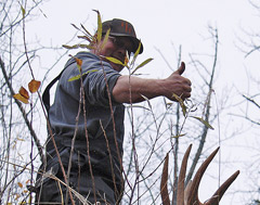 We agreed that I would keep floating on the river to glass and he would track on the bush line against the shore. The best way to describe it is that there was heavy, thick forest, and then 30 metres of heavy willows, saplings, etc. that was “flat” between the forest and the edge of the drop to shore. The beavers did that. All kinds of waist-high logs lying crisscross from the beavers. The edge was 15 feet higher than the shore and very steep to the water. I floated down river for 30 minutes and stopped to get out to glass. I saw something move and there was the moose standing 150 metres across from me in a thicket on the edge. I got Kirk’s attention to make sure my line was safe, based on where he and Harv were. I knocked the bull down with a finishing shot.