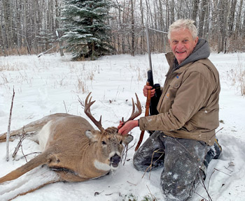 As is tradition with our party, on the way back to the ranch with Ole Hank loaded up, we encountered a mid-morning buck cruising in a cutblock. We set up on a cutline directly to the north of him to see if we could get a shot opportunity for Eugene. Sure enough, the buck dutifully followed a lone doe across the fence and gave us his broadside at 170 yards. Eugene, who hasn’t hunted for many years, let fly his 7mm-08, made a perfect shot, and down went brown.
